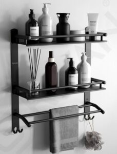 RIVAN Stainless Steel Multipurpose Double Layer Bathroom Shelf with Towel Road Racks Wall Mount Bath Shelf Organizer, Bathroom Accessories (Black Matte Finish)